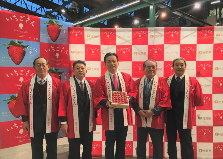 青果物取扱量日本一の東京・大田市場で、1月28日(火)早朝6時40分から、山口知事、JAさが 大島組合長、JAからつ 堤組合長、JA伊万里 岩永組合長、そして県いちご部会 本弓部会長出席のもと、市場関